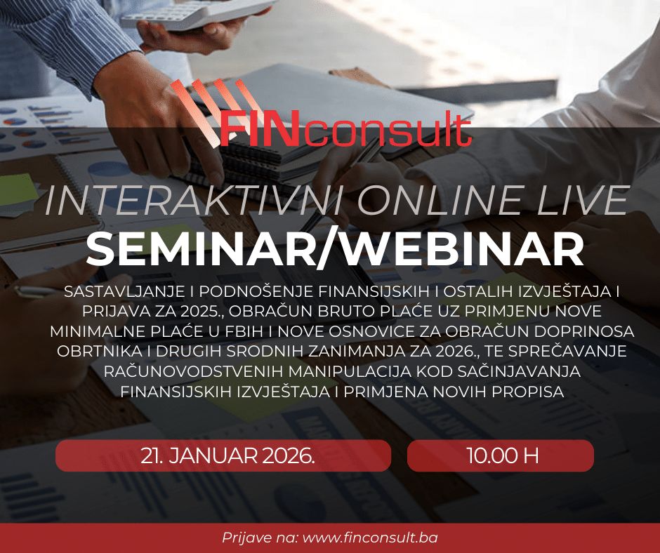 FINconsult će u skladu sa godišnjim planom održati interaktivni online live seminar/webinar u okviru 1. ciklusa seminara kontinuirane edukacije finansijsko-računovodstvene profesije u Bosni i Hercegovini u 2026. godini.