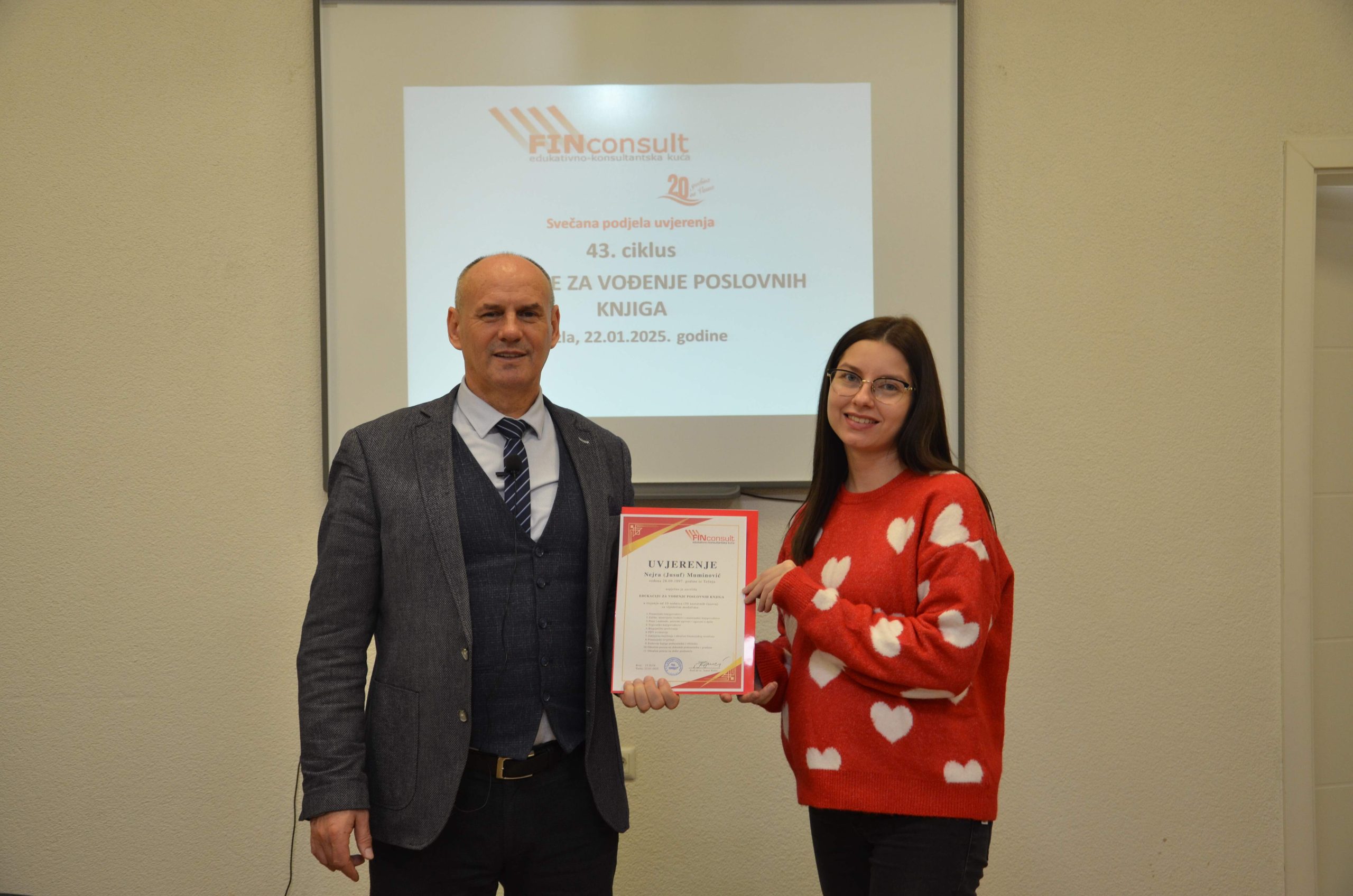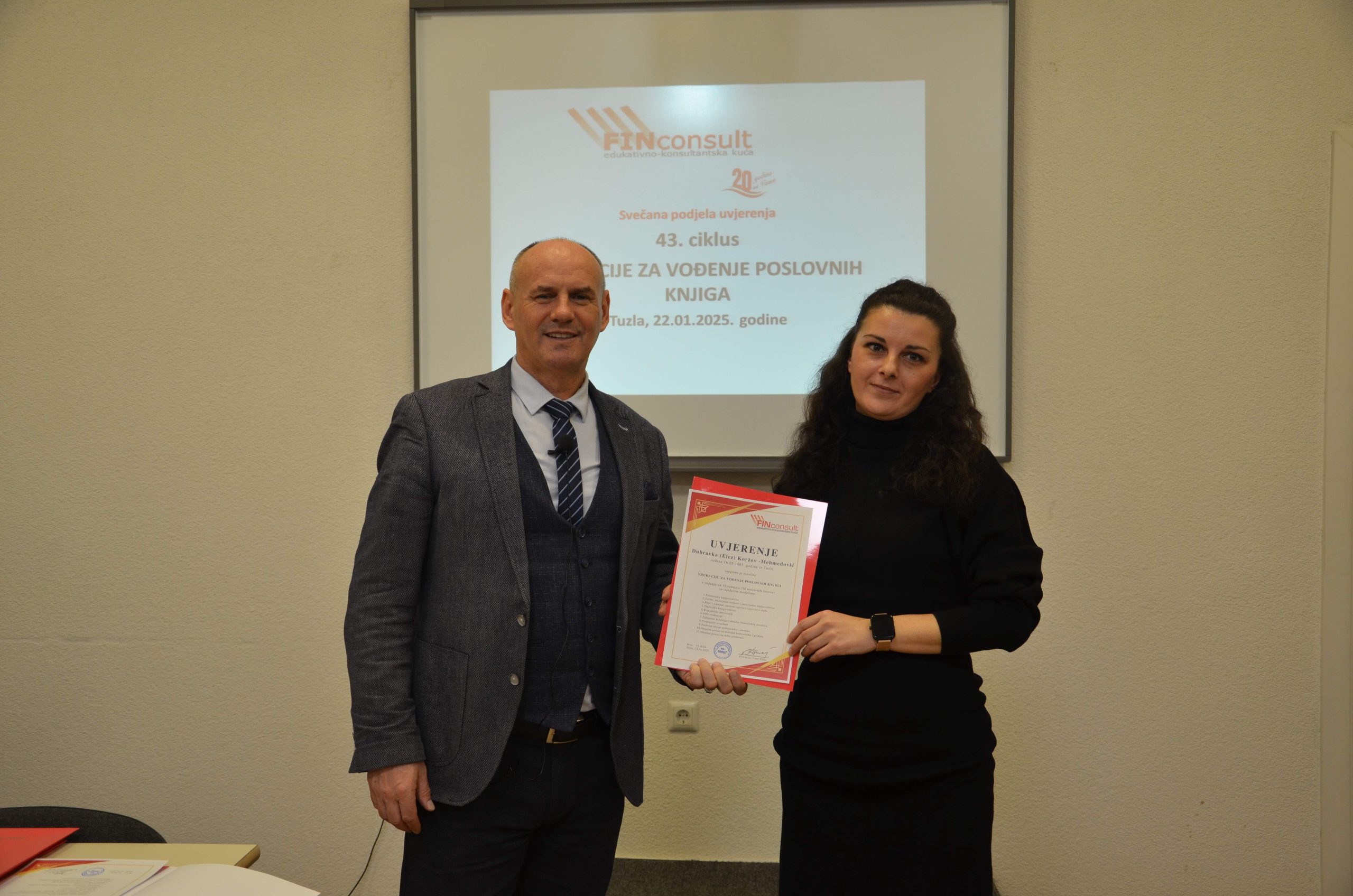 Edukativno-konsultantska kuća FINconsult završila je 43. ciklus Edukacije za vođenje poslovnih knjiga. Edukaciju je uspješno završio 31 učesnik. Do sada je ovu edukaciju uspješno završilo više od 2.800 osoba, od kojih je više od 90% pronašlo svoju profesionalnu orijentaciju i dobilo zaposlenje na knjigovodstveno-računovodstvenim poslovima.